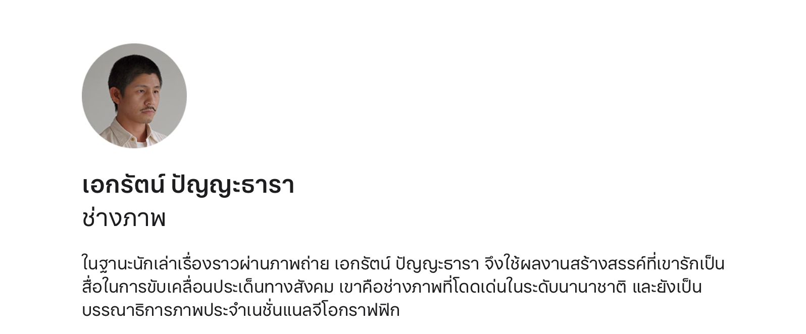 เอกรัตน์ ปัญญะธารา นักเล่าเรื่องผ่านภาพถ่าย ที่ใช้ผลงานสร้างสรรค์ที่เขารักเป็นสื่อในการขับเคลื่อนประเด็นทางสังคม เป็นช่างภาพที่โดดเด่นในระดับนานาชาติ และยังเป็นบรรณาธิการภาพประจำเนชั่นแนลจีโอกราฟฟิก