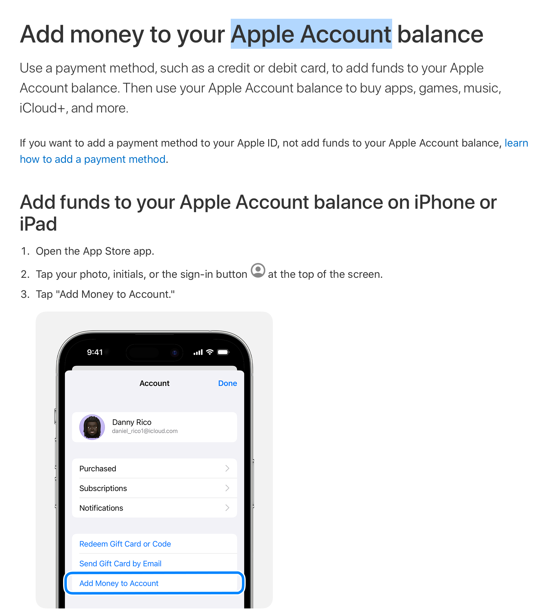 Apple ใช้ชื่อ Apple Account แล้วในการตั้งค่ายอดคงเหลือในบัญชี Apple ของผู้ใช้ (ชื่อภาษาไทยเรียกว่า “บัญชี Apple”) โดย Mark Gurman หลังจากที่ Apple ใช้ชื่อ “Apple Account” ก็จะยกเลิกการใช้ชื่อ “Apple ID” ที่ถูกใช้มานานกว่า 20 ปี
