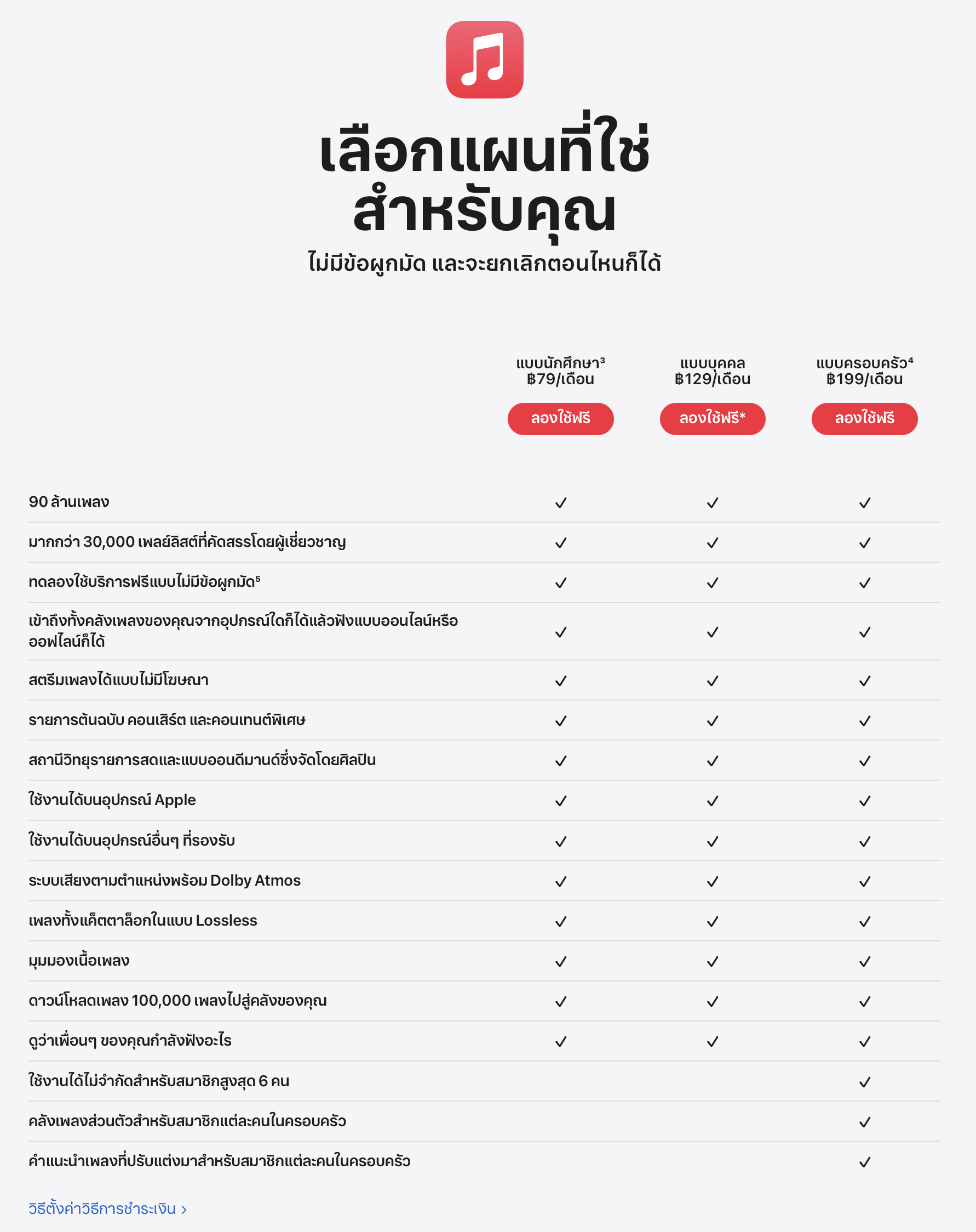 สำหรับแผนบริการ Apple Music ประกอบไปด้วยแบบบุคคลทั่วไปราคา 129 บาทต่อเดือน แบบนักศึกษา 79 บาทต่อเดือน แบบครอบครัว 199 บาทต่อเดือน และผ่าน Apple One ในราคาเริ่มต้น 225 บาทต่อเดือน
