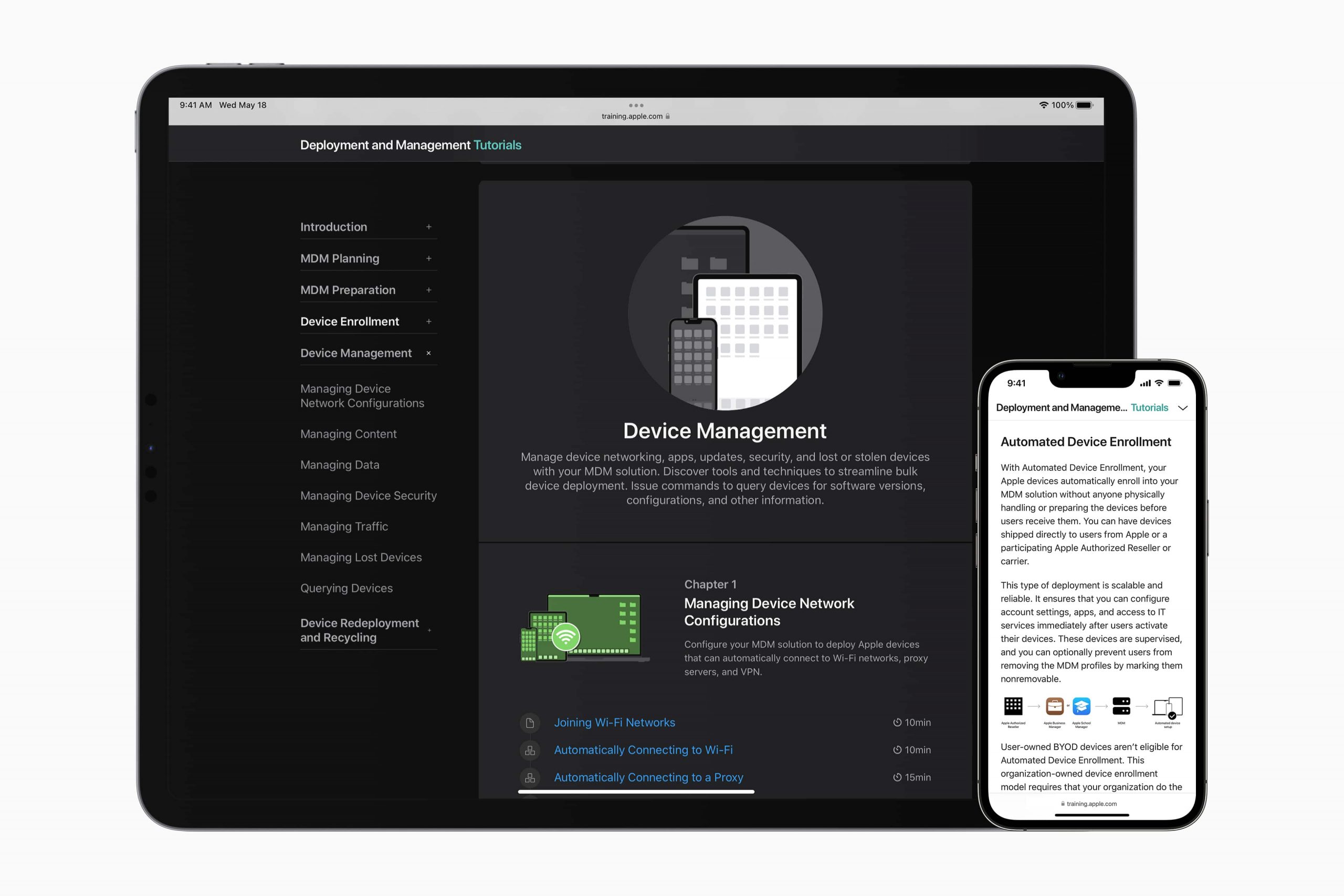 Apple Deployment and Management เป็นหลักสูตรที่ครอบคลุมวิธีการกำหนดค่า จัดการ และดูแลความปลอดภัยให้กับผู้ใช้ผลิตภัณฑ์ Apple โดยใช้การจัดการอุปกรณ์พกพา (MDM) ผู้เรียนจะได้ลองใช้ Apple Business Manager และ Apple School Manager ด้วย โดยหลักสูตรนี้ใช้เวลาเรียนประมาณ 13 ชั่วโมง หากเรียนเสร็จก็สอบเพื่อขอใบรับรอง Apple Certified IT Professional ได้เช่นกัน