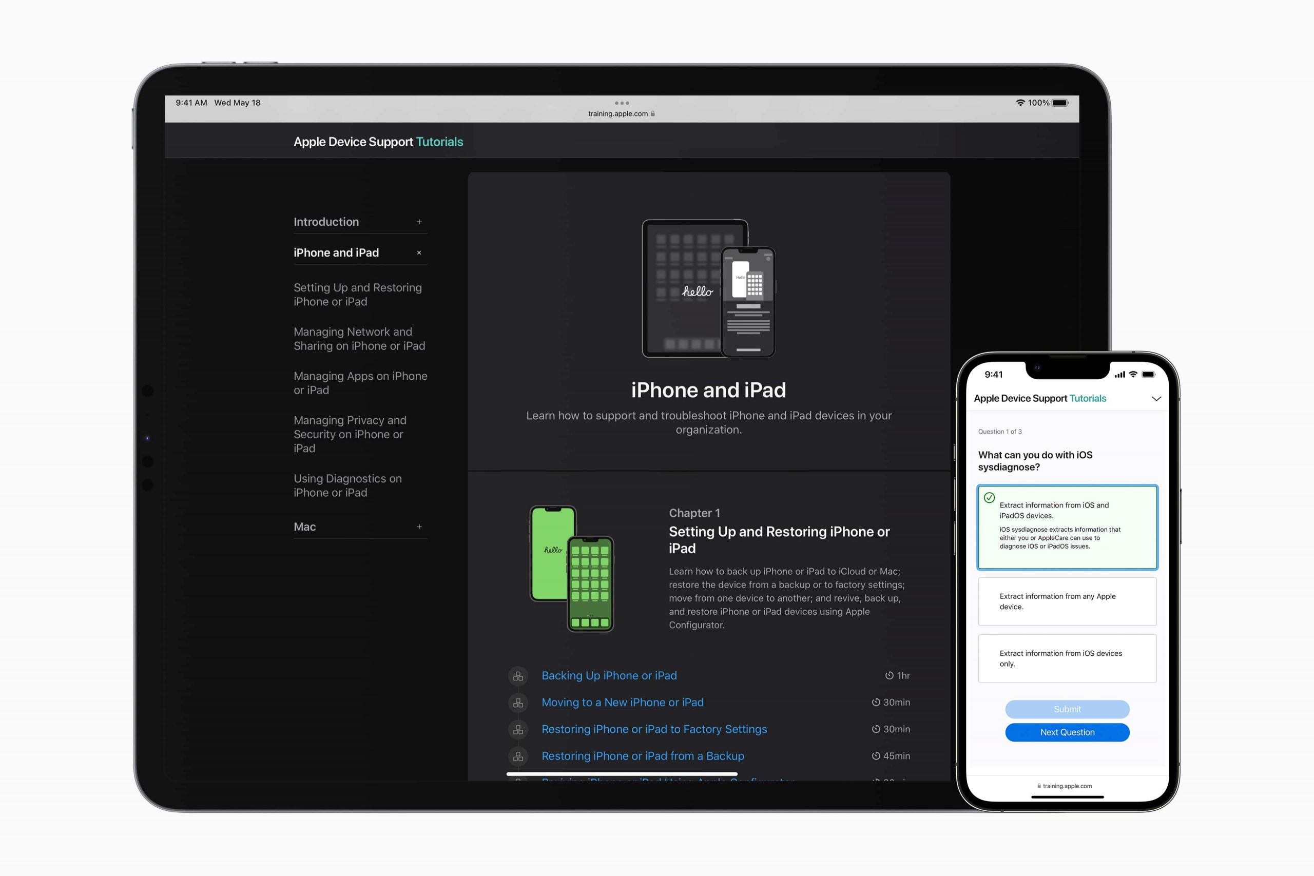 Apple Device Support มีเนื้อหาครอบคลุมเรื่องเครื่องมือ บริการ และแนวทางการปฏิบัติที่ดีที่สุด เพื่อให้ผู้เรียนสามารถให้บริการช่วยเหลือด้านเทคนิคของ iPhone, iPad, Mac ให้บุคลากรในองค์กรได้ โดยเนื้อหาหากศึกษาจนครบจะใช้เวลาประมาณ 14 ชั่วโมง และผู้เรียนสามารถสอบเพื่อขอใบรับรอง Apple Certified Support Professional จาก Apple ได้