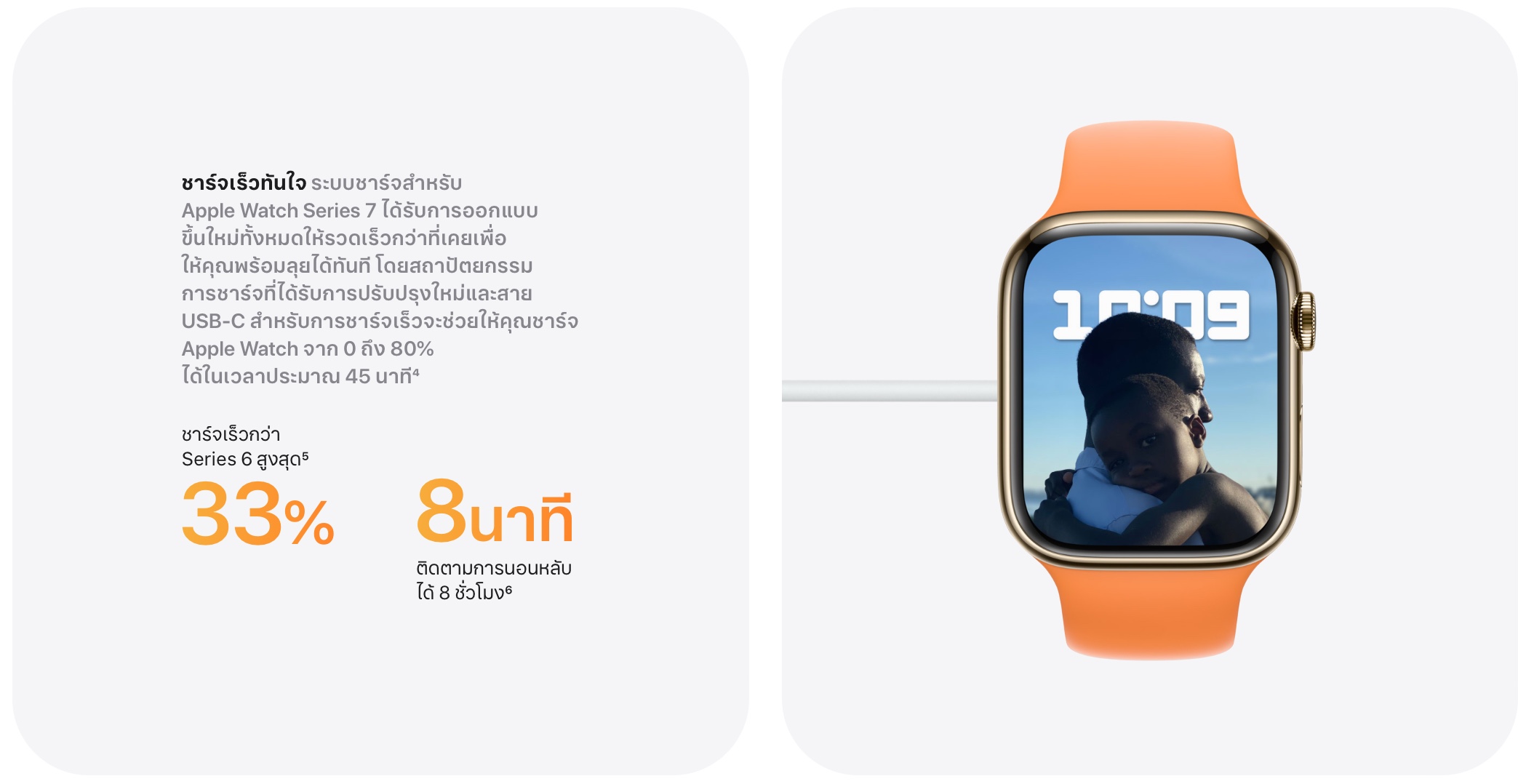 Apple Watch Series 7 มีอายุการใช้งานแบตนาน 18 ชั่วโมงต่อการชาร์จหนึ่งครั้ง และชาร์จเร็วขึ้น 33% เมื่อใช้สายชาร์จแบบใหม่ ร่วมกับหัวชาร์จ USB-C 20W