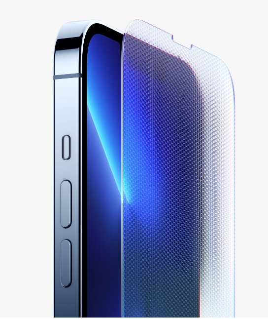iPhone 13 Pro, iPhone 13 Pro Max ใช้กระจกหน้าจอแบบ Ceramic Shield, ปรับกล้องหน้า TrueDepth ให้เล็กลง 20% มีพื้นที่การแสดงผลมากขึ้น, กรอบจตัวเครื่องใช้แบบสแตนเลสสตีล ฝาครอบเลนส์ใช้ผลึกแซฟไฟร์ และตัวเครื่องทนน้ำที่ระดับ IP68