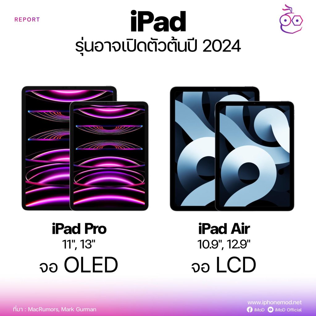 - Apple จะเปิดตัว iPad รุ่นใหม่ในเดือนหน้า ซึ่งรวมถึง iPad Pro รุ่นใหม่ที่ใช้ชิป M3 และมาพร้อมหน้าจอ OLED เป็นครั้งแรก
