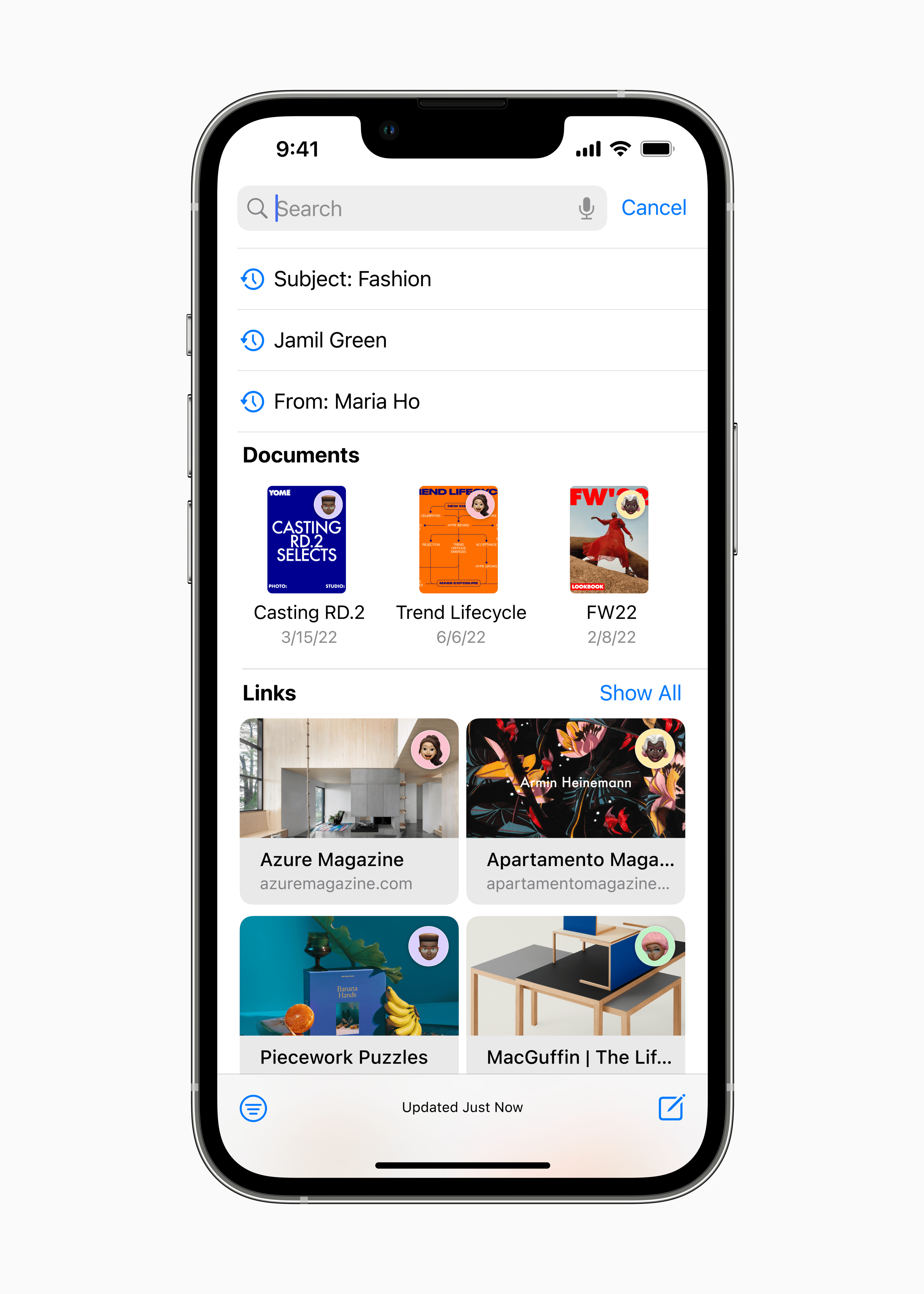 แอปเมลมีการค้นหาที่ดียิ่งขึ้น ในการค้นหาสิ่งต่าง ๆ ในแอปเมลจะแสดงผลลัพธ์ได้ถูกต้องแม่นยำและครบถ้วนยิ่งขึ้น เช่น ลิ้งก์ รายชื่อผู้ติดต่อ หัวเรื่องอีเมล แถมยังแสดงคำแนะนำการค้นหาตั้งแต่ก่อนที่เราจะเริ่มพิมพ์อีกด้วย