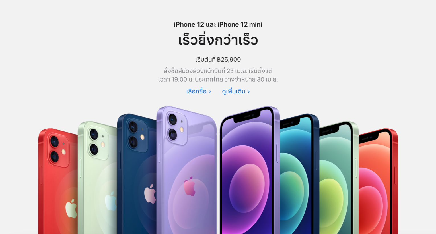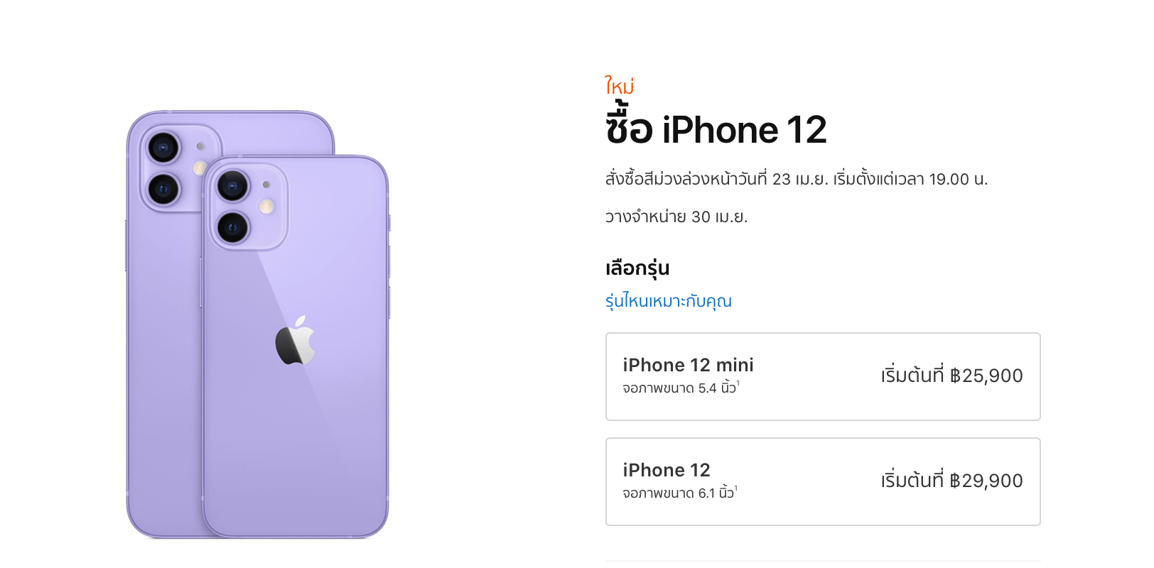 ในไทยสามารถกดสั่งซื้อ iPhone 12 และ iPhone 12 mini สีม่วง ล่วงหน้าได้ในวันที่ 23 เมษายน 2021 ในราคาเท่าเดิม ที่เว็บไซต์ Apple Store ออนไลน์ประเทศไทย