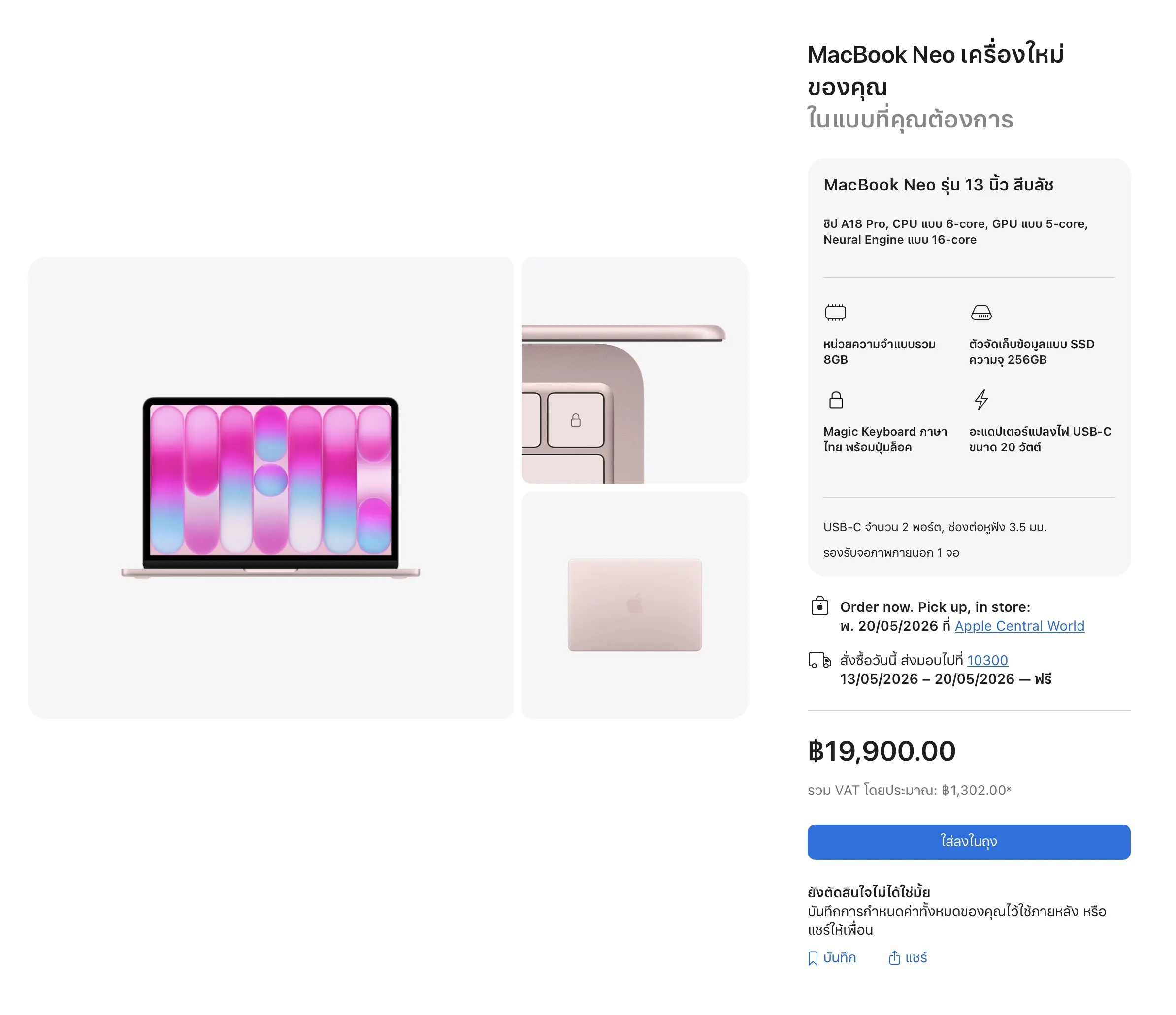 ณ วันที่เผยแพร่ข้อมูลนี้ หากสั่งซื้อ MacBook Neo ผ่าน Apple Store ออนไลน์ จะไม่สามารถรับเครื่องได้จนกว่าจะถึงเดือน พ.ค. ซึ่งหมายความว่าสินค้าถูกจองเต็มตลอดเดือน เม.ย. แล้ว โดยทุกสี และทั้งรุ่นความจุ 256GB และ 512GB จะเริ่มจัดส่งเร็วสุดระหว่างวันที่ 1–8 พ.ค.