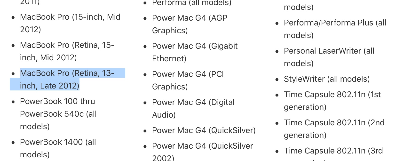 Apple ขึ้นบัญชี MacBook Pro 13 นิ้วปลายปี 2012 ซึ่งเป็น MacBook Pro 13 นิ้วจอ Retina รุ่นแรก เป็นผลิตภัณฑ์ที่ยกเลิกการผลิตแล้ว (Obsolete)