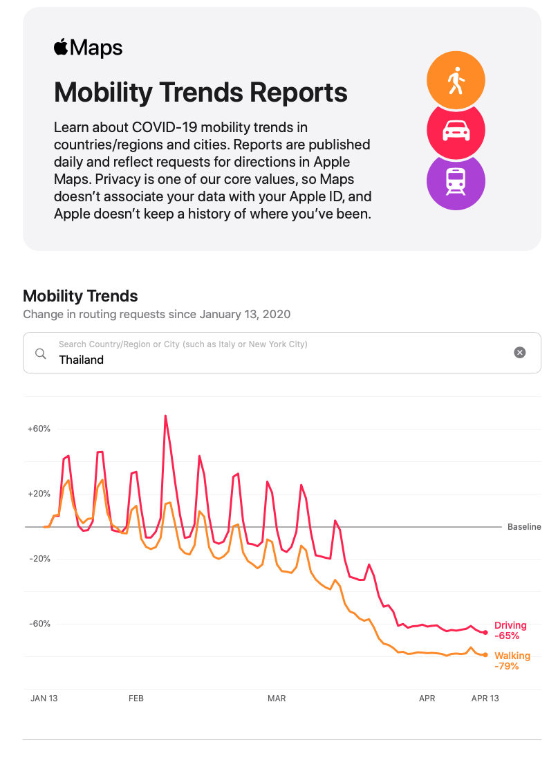 Apple เปิดให้เข้าถึงข้อมูลการเคลื่อนที่ แสดงให้เห็นถึงการเปลี่ยนแปลงปริมาณผู้คนที่กำลังขับรถ เดิน หรือใช้ระบบขนส่งสาธารณะในชุมชน เพื่อนำข้อมูลไปต่อยอดสำหรับการรับมือ COVID-19