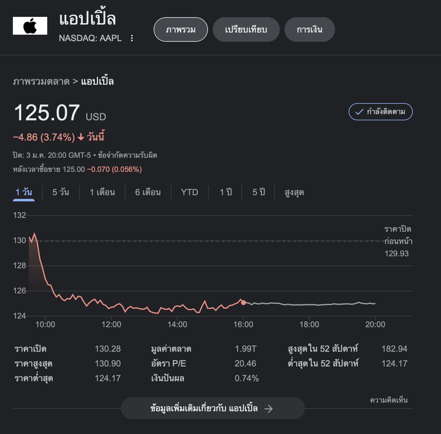 *มูลค่าตลาด Apple เหลือ 1.99 ล้านดอลลาร์, ราคาหุ้น 125.07 ดอลลาร์ต่อหุ้น ณ วัน เวลา ที่เผยข้อมูลนี้