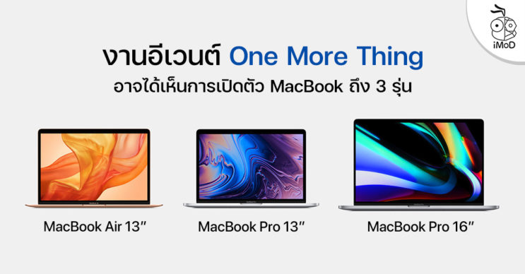 รายงานจาก Bloomberg ระบุว่า เราอาจจะได้เห็นการเปิดตัวของ MacBook รุ่นใหม่ถึง 3 รุ่นด้วยกัน ได้แก่ MacBook Pro 13 นิ้ว, MacBook Pro 16 นิ้ว และ MacBook Air 13 นิ้วในงานอีเวนต์เดือนพฤศจิกายนนี้