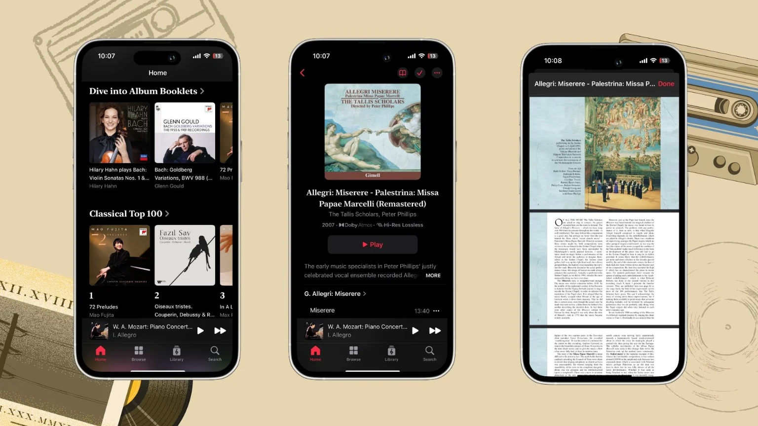 Apple Music Classical เพิ่มบุ๊คเล็ทอัลบั้ม “thousands of albums” โดยในบุ๊คเล็ทเหล่านี้มักจะมีรูปภาพพิเศษ รายละเอียดเกี่ยวกับการประพันธ์เพลงจากศิลปิน เนื้อเพลง และอื่น ๆ Apple ได้เพิ่มส่วน “Dive into ALbum Booklets” ในแท็บหน้าแรกของแอป เมื่อให้เราได้เห็นบุ๊คเล็ทอัลบั้มใหม่จาก Apple Music Classical