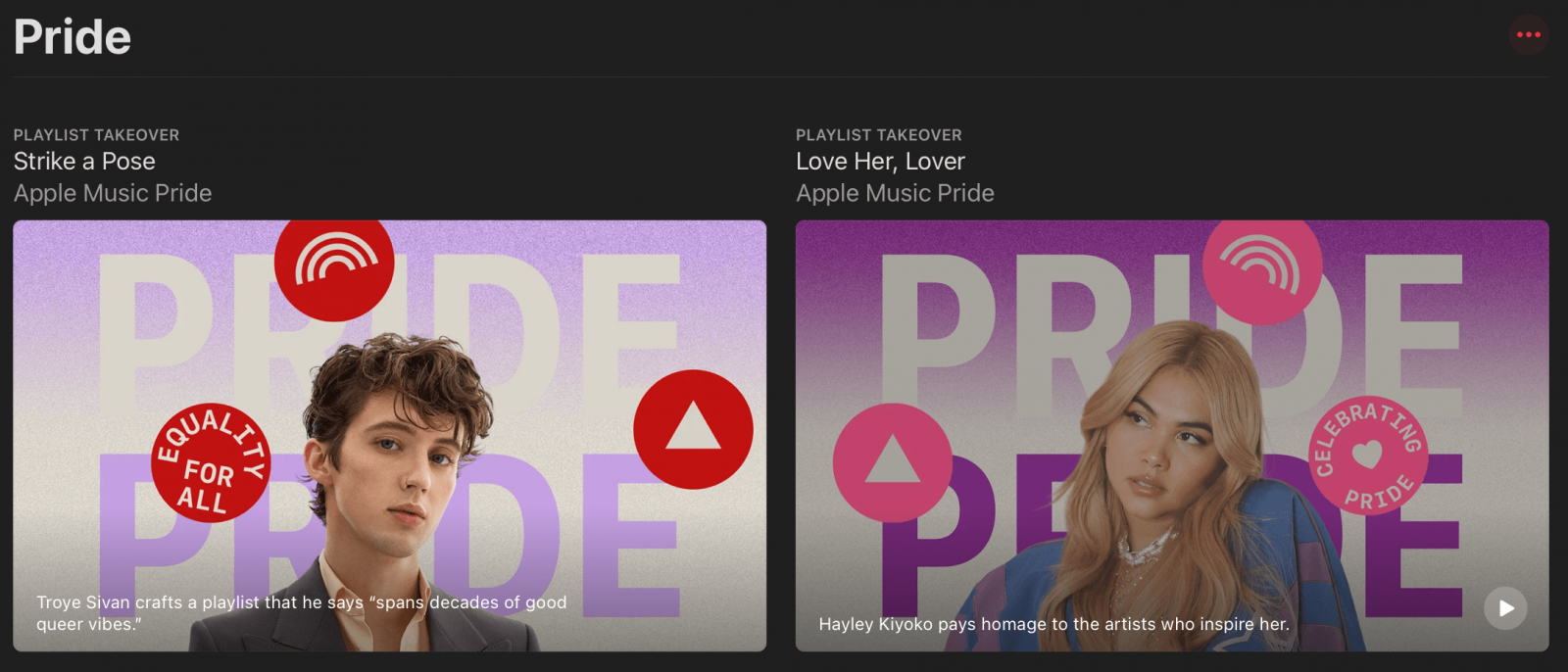 • เพลย์ลิสต์โดยศิลปินรับเชิญ ที่ได้ศิลปินชื่อดังมาร่วมเลือกเพลงที่แสดงถึงนิยามความ Pride ในแบบของตัวเองอย่าง Hayley Kiyoko (ในเพลย์ลิสต์ Love Her, Lover), Mykki Blanco (RESIST!), Troye Sivan (Strike a Pose), Tayla Parx (Here ’n’ Queer) และ Claud (Thrive)