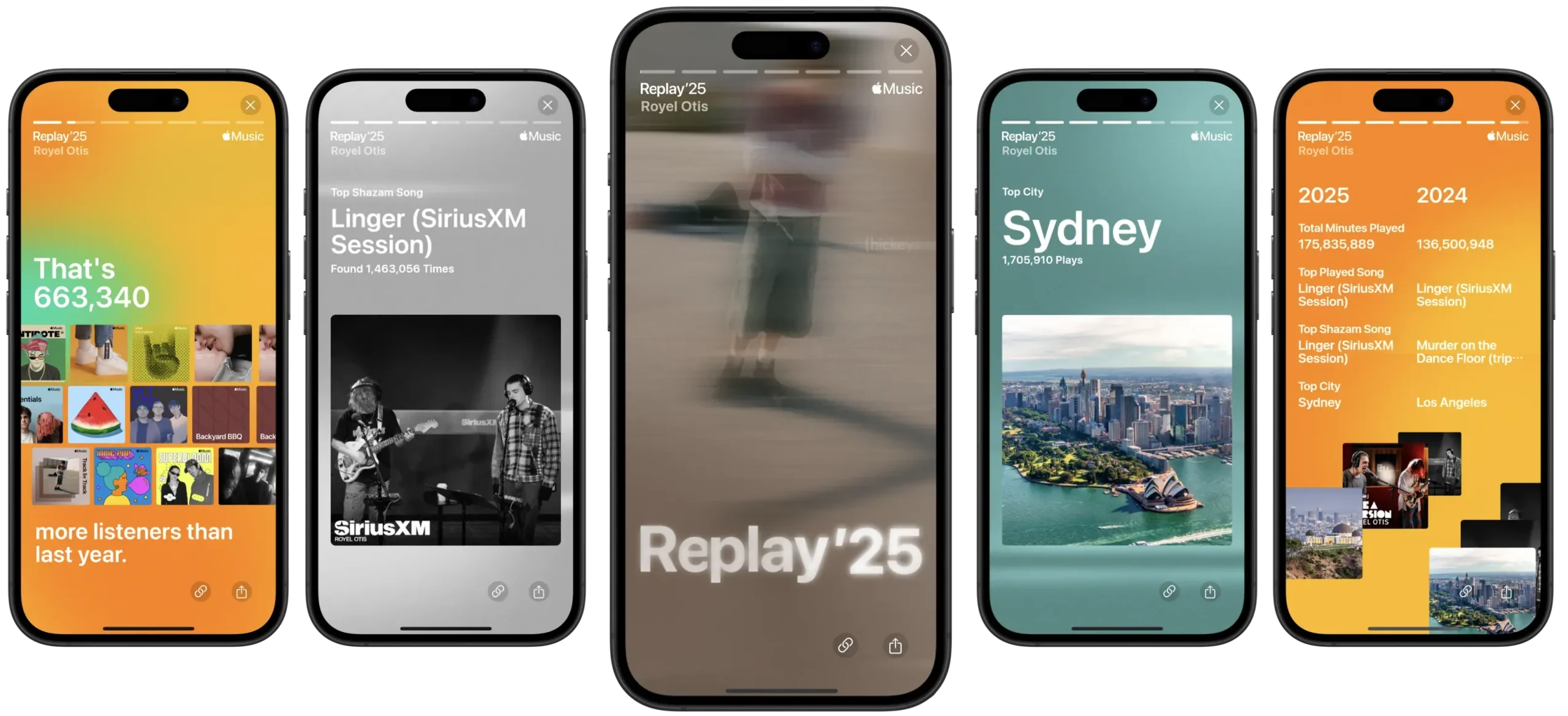 และผู้ใช้ยังสามารถดูเรื่องราวทางดนตรีแห่งปีของพวกเขาได้ผ่านสถิติต่าง ๆ จากผู้ฟังเอง ได้แก่ จำนวนนาทีการฟังทั้งหมด, จำนวนศิลปินที่ฟังทั้งหมด, สถิติการฟังศิลปินเดิมต่อเนื่องยาวนานที่สุด (Longest artist streak), แนวเพลงโปรด และอื่น ๆ โดยตอนนี้ Replay ’25 พร้อมใช้งานในแอป Apple Music ได้สร้างภาพที่สมบูรณ์ยิ่งขึ้นของความสัมพันธ์ที่ไม่เหมือนใครของผู้ใช้แต่ละคนกับดนตรี และการพัฒนาของความชอบตลอดทั้งปี โดยเฉพาะอย่างยิ่งเมื่อพูดถึงศิลปิน อัลบั้ม และเพลงโปรดของแต่ละคน