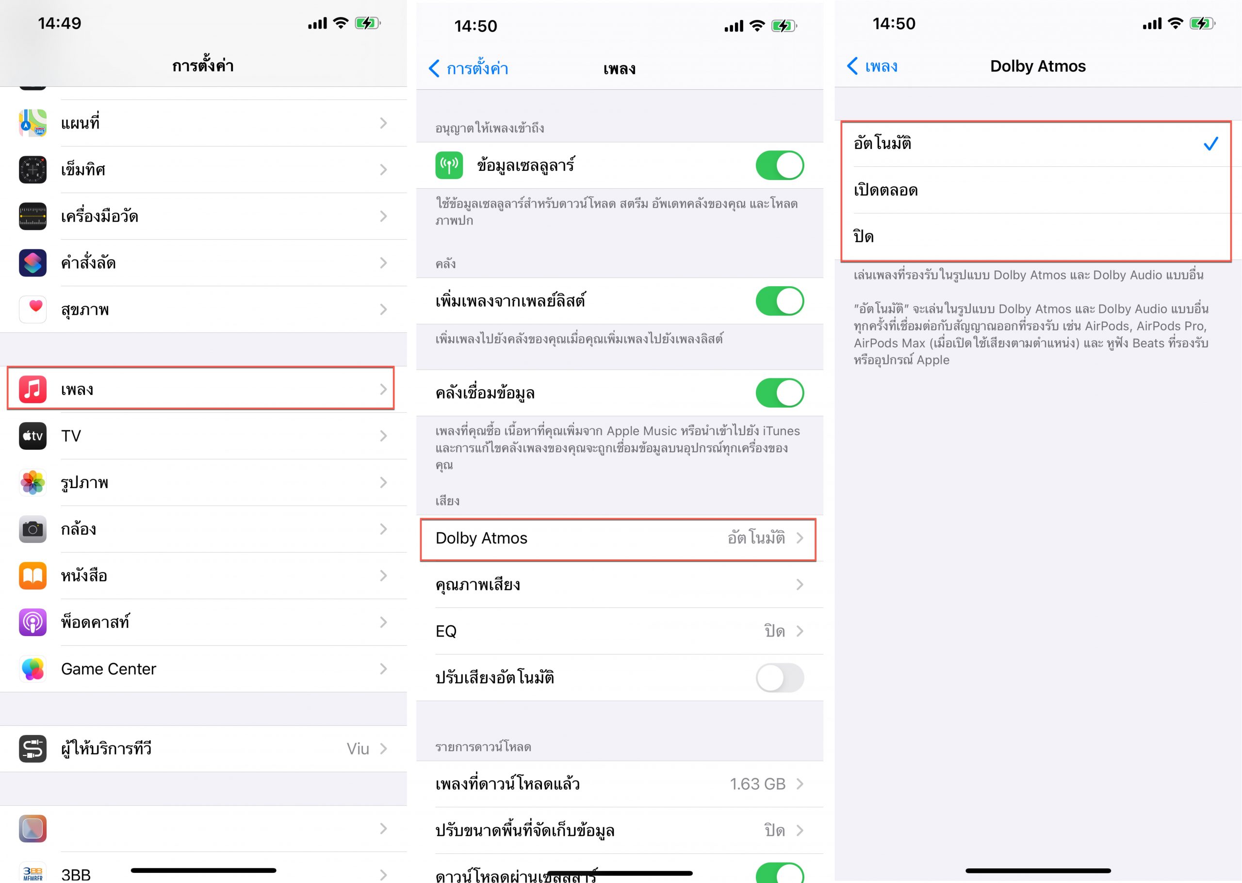 การตั้งค่า > เพลง > Dolby Atmos > เลือกตามต้องการ