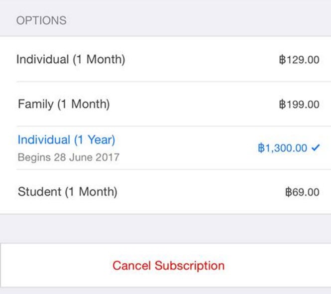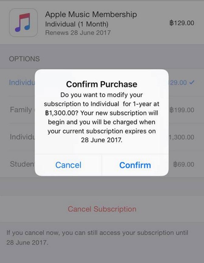 สามารถเข้าไปเปลี่ยนรูปแบบ Subscription ได้ที่ Settings > iTunes & App Store > Apple ID > View Apple ID > Subscriptions > Apple Music Membership > Individual (1 Year)