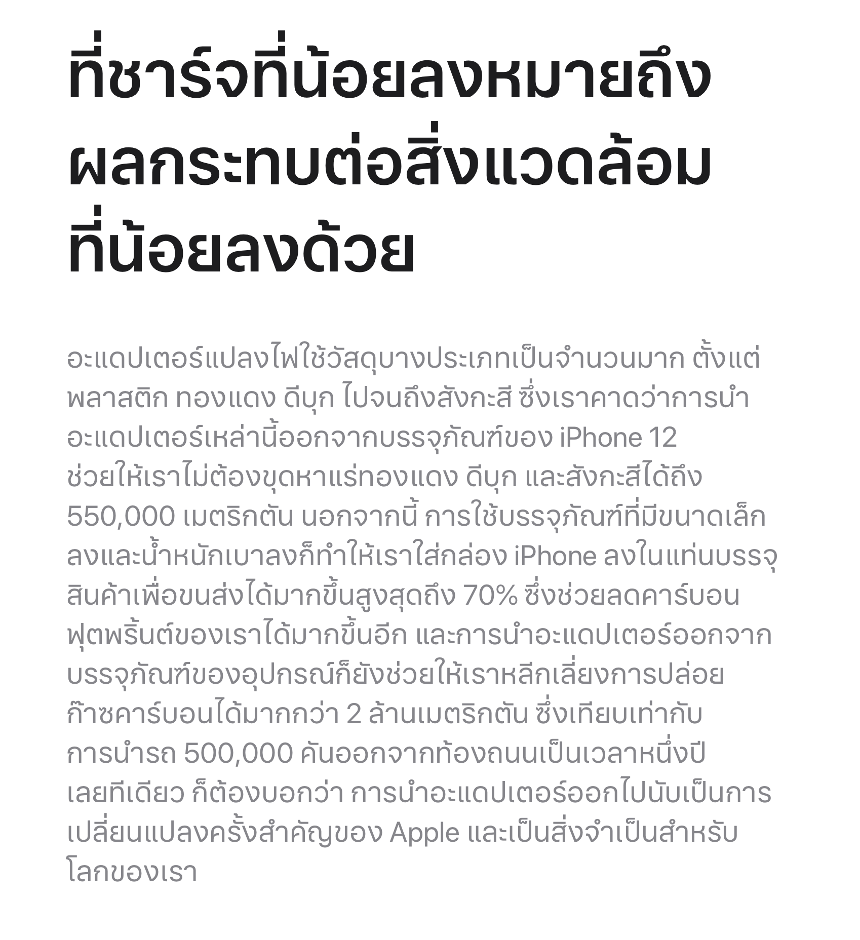Apple ได้เผยข้อมูลเกี่ยวกับผลของการไม่ใส่อะแดปเตอร์มาในกล่อง iPhone ที่เริ่มทำตั้งแต่ iPhone 12 เป็นต้นมาว่าลดผลกระทบต่อสิ่งแวดล้อมได้อย่างมากมาย