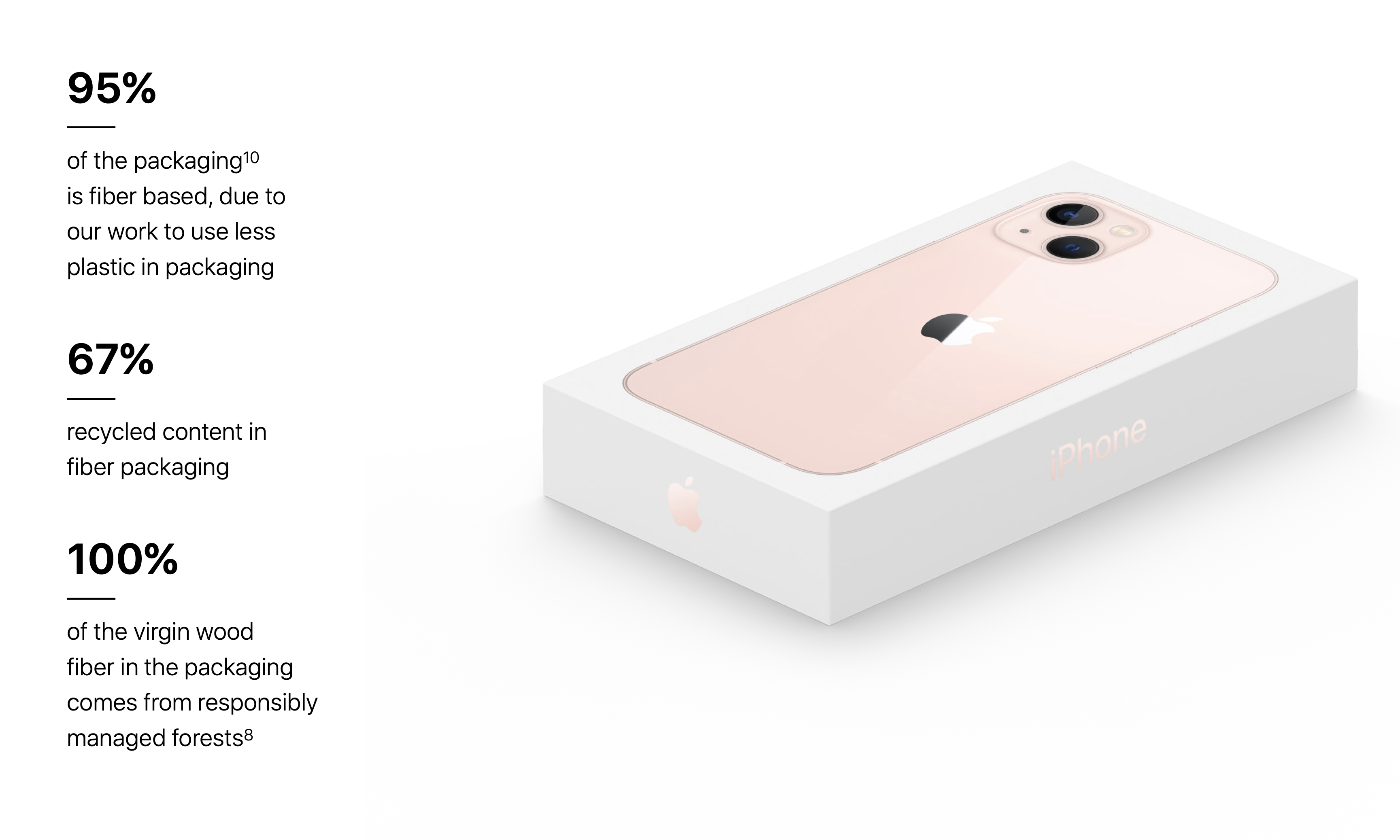 Apple เลิกใส่อะแดปเตอร์มาในกล่อง iPhone มาตั้งแต่ iPhone 12 และเลิกใช้พลาสติกหุ้มมาเป็นสติ๊กเกอร์กระดาษแทน โดย Apple เผยว่าเป็นนโยบายการลดขยะอิเล็กทรอนิกส์ พลาสติกและขยะอื่น ๆ ด้วย ซึ่ง Apple ตั้งเป้าจะเป็นกลางทางคาร์บอนในปี 2030