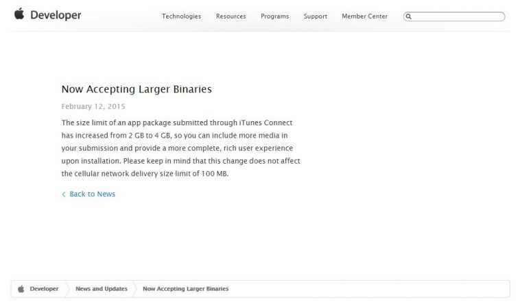 สำหรับการยอมรับไบนารีขนาดใหญ่เพื่อส่งไปให้ Apple ตรวจสอบผ่าน iTunes Connect เดิมทีถูกจำกัดอยู่ที่ 2 GB (และอีตา Infinity Blade III ก็ใช้ไปเต็มที่ถึง 1.92 GB) เปลี่ยนเป็น 4 GB เพื่อให้นักพัฒนาโดยเฉพาะเกมสามารถปล่อยแสงได้ยิ่งใหญ่อลังการกว่าเดิม (รึเปล่า?)