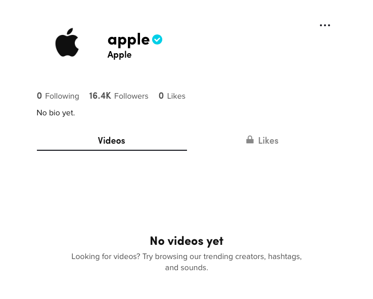 สำหรับบัญชี Tik Tok ของ Apple ใช้ชื่อว่า @apple โดย Apple ได้สร้างบัญชีนี้ไว้ แต่ยังไม่โพสต์อะไร