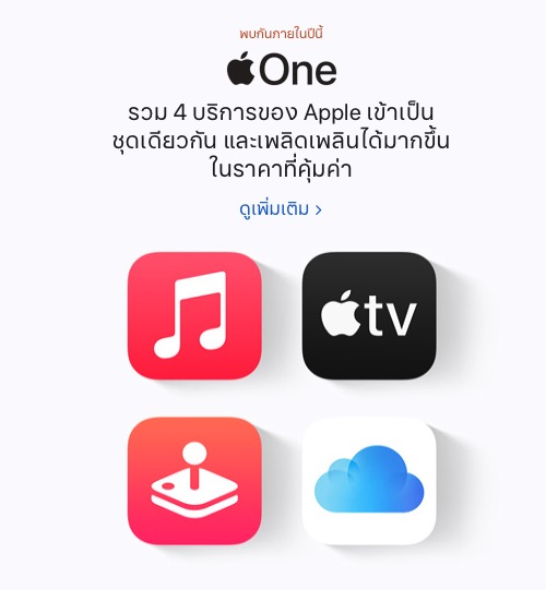 - แบบบุคคล รวมบริการ Apple Music, Apple TV+, Apple Arcade และ iCloud ขนาด 50 GB รับสมัครในราคา 225 บาทต่อเดือน