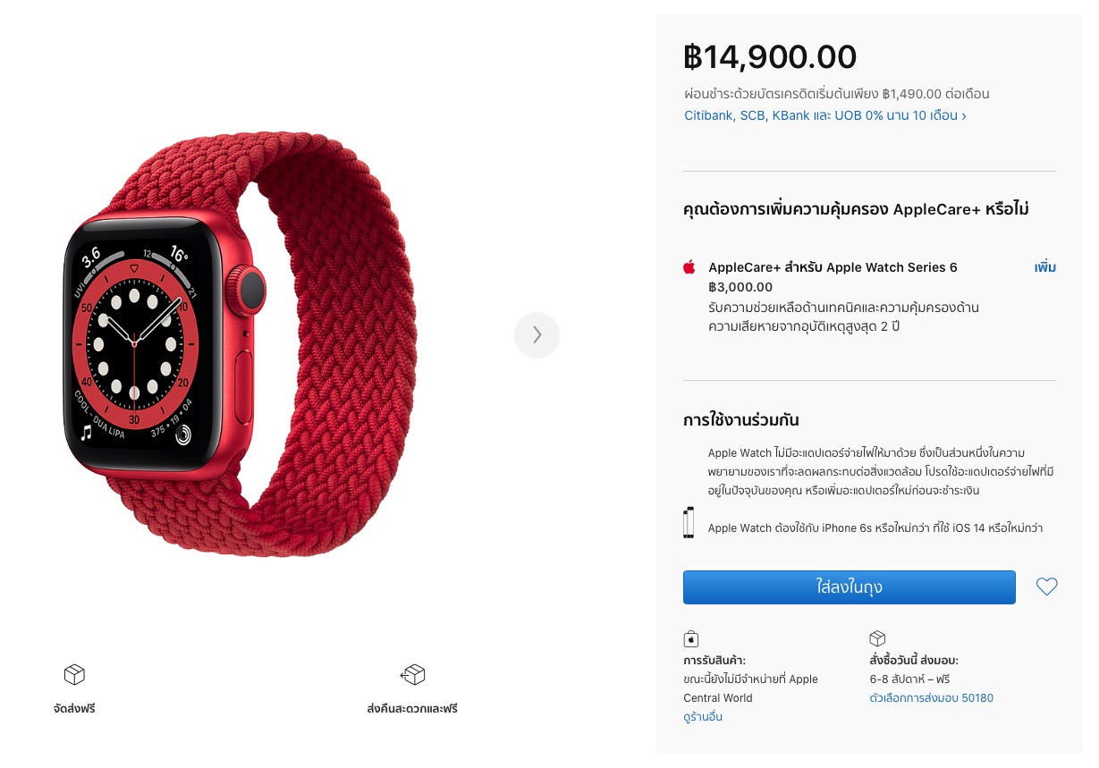 ส่วนถ้าซื้อ Apple Watch Series 6 สีแดง (PRODUCT)RED รุ่น GPS พร้อมสาย Braided Solo Loop (PRODUCT)RED ซื้อได้ในราคา 14,900 บาท