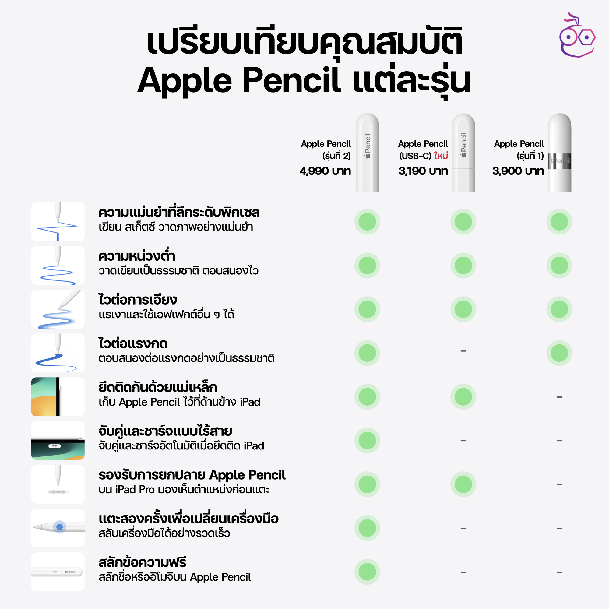 Apple เปิดตัว Apple Pencil รุ่นใหม่ มาพร้อมพอร์ต USB-C ในราคาเพียง 3,190 บาท เป็น Apple Pencil ที่มีราคาถูกที่สุดในบรรดารุ่นที่วางจำหน่ายในปัจจุบัน เรามาชมกันว่าแต่ละรุ่นนั้นมีคุณสมบัติอะไรบ้าง