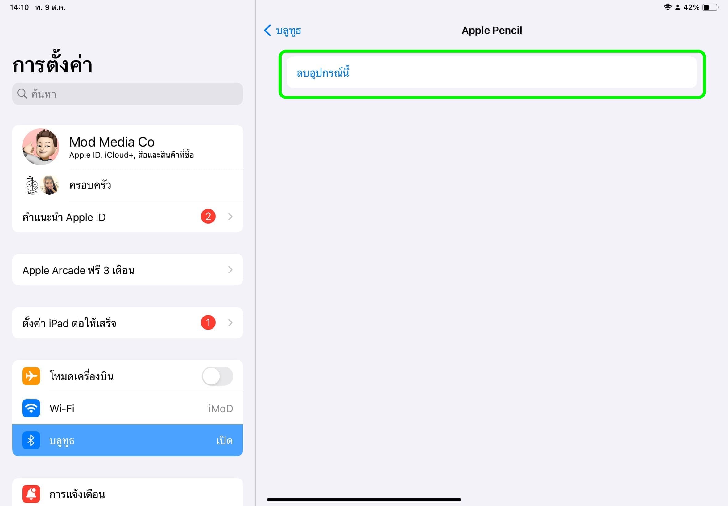 บางครั้ง การเชื่อมต่อบลูทูธระหว่าง Apple Pencil และ iPad อาจไม่เสถียร ให้ลองลบการเชื่อมต่อในบลูทูธแล้วค่อยจับคู่กันใหม่อีกรอบ