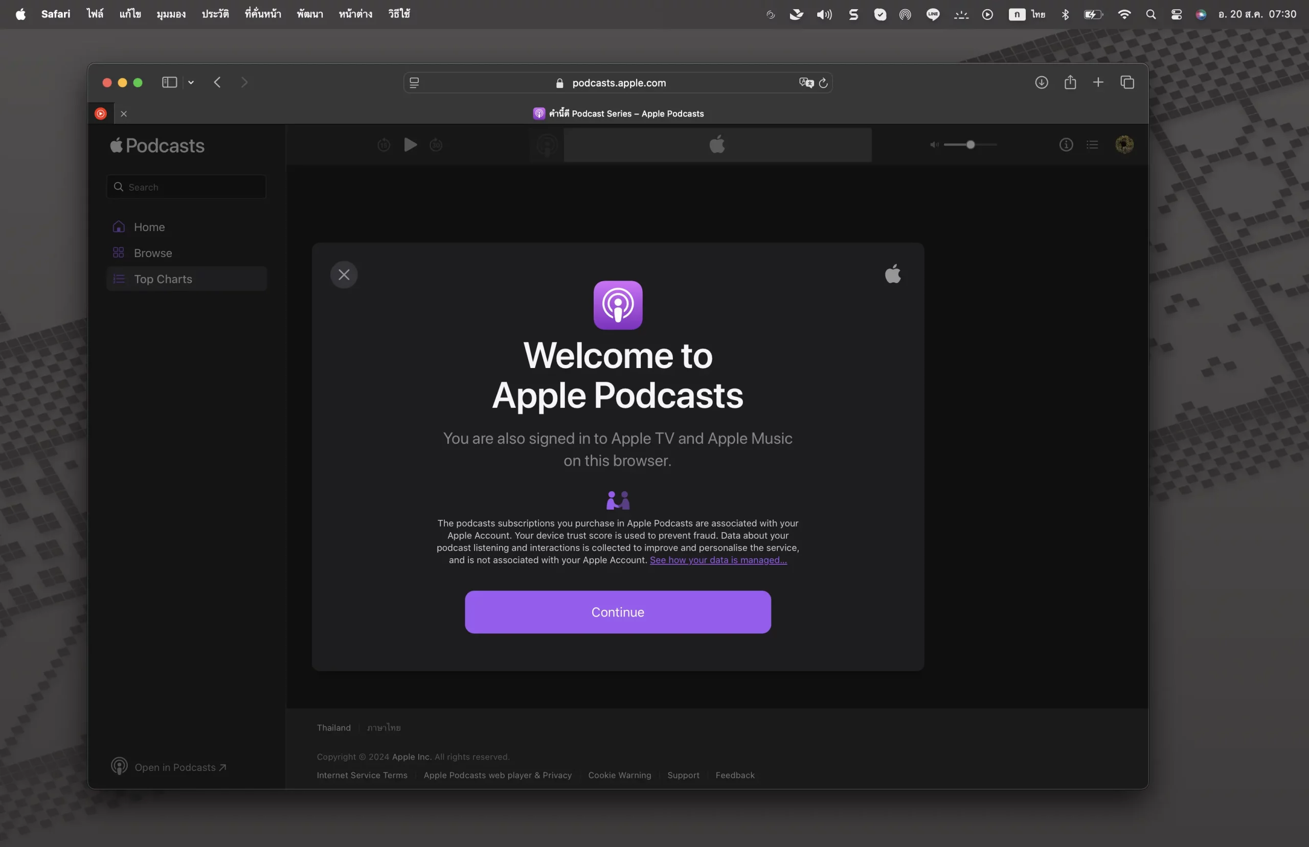 ผู้ใช้สามารถใช้ Apple ID ในการเข้าสู่ระบบเพื่อใช้งาน Apple Podcasts บนเว็บได้ที่ : https://podcasts.apple.com/th/