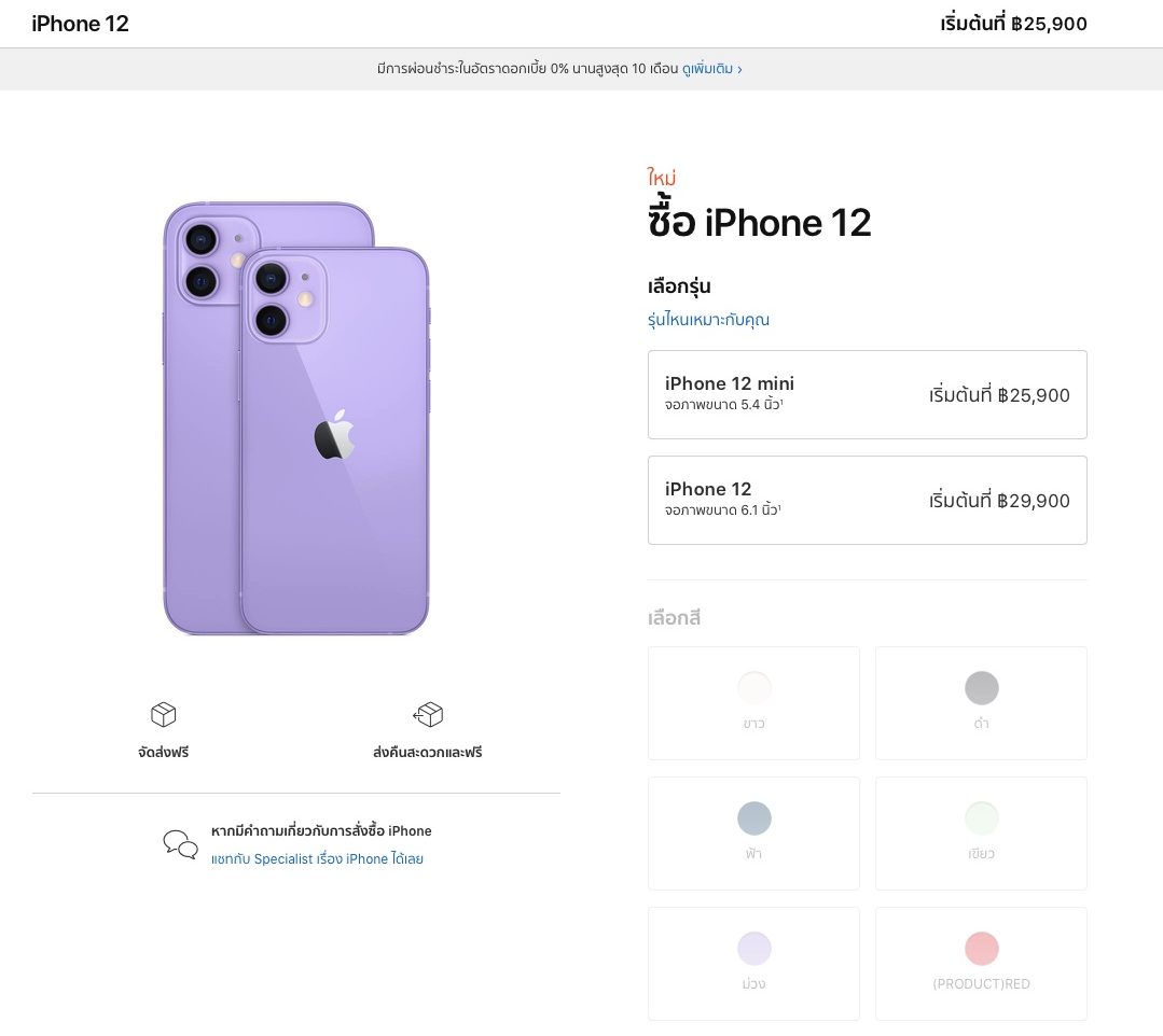 23 เม.ย. 64, Apple เปิดให้สั่งซื้อล่วงหน้า iPhone 12, iPhone 12 mini สีม่วงได้แล้วที่ Apple Store ออนไลน์ สเปคเดิมแต่สีใหม่ กำหนดเปิดขายวันที่ 30 เม.ย.