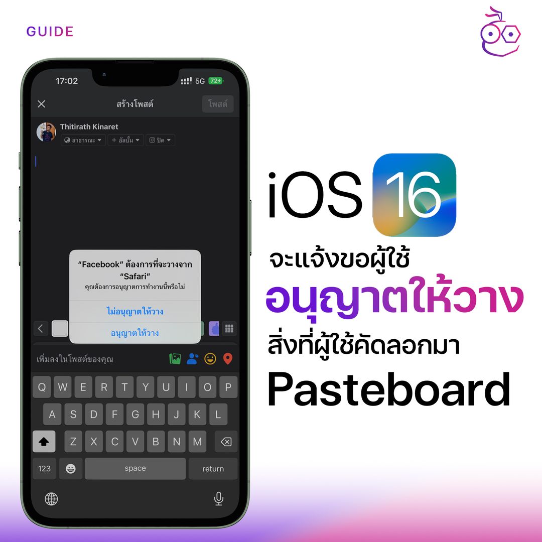 iOS 16 ช่วยให้ผู้ใช้มีความเป็นส่วนตัวมากขึ้น โดยเพิ่ม “การอนุญาตใช้งานกระดานพักข้อมูล (Pasteboard)” ซึ่งแอปจะต้องได้รับอนุญาตจากผู้ใช้ก่อนจึงจะสามารถใช้ Pasteboard เพื่อวางข้อมูลที่คัดลอกมาจากแอปอื่นได้