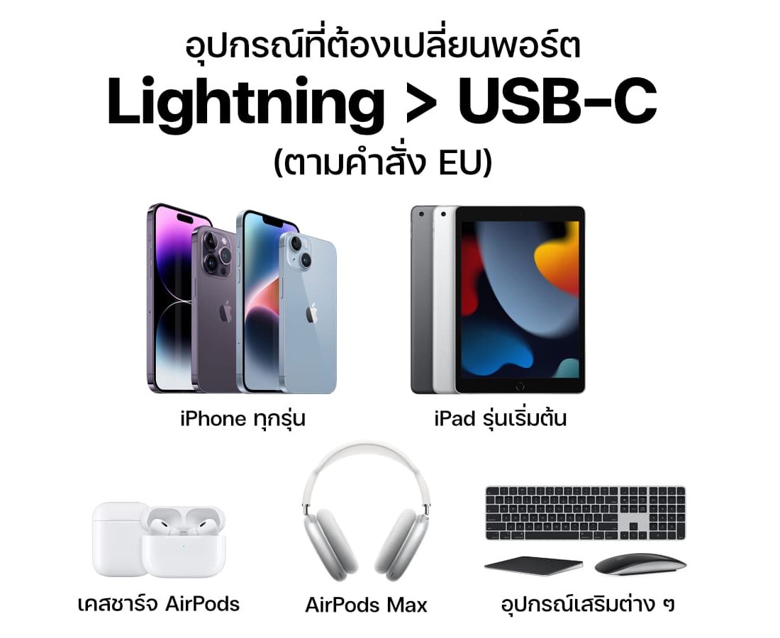 - iPhone ทุกรุ่น ซึ่งตอนนี้ยังใช้พอร์ต Lightning อยู่