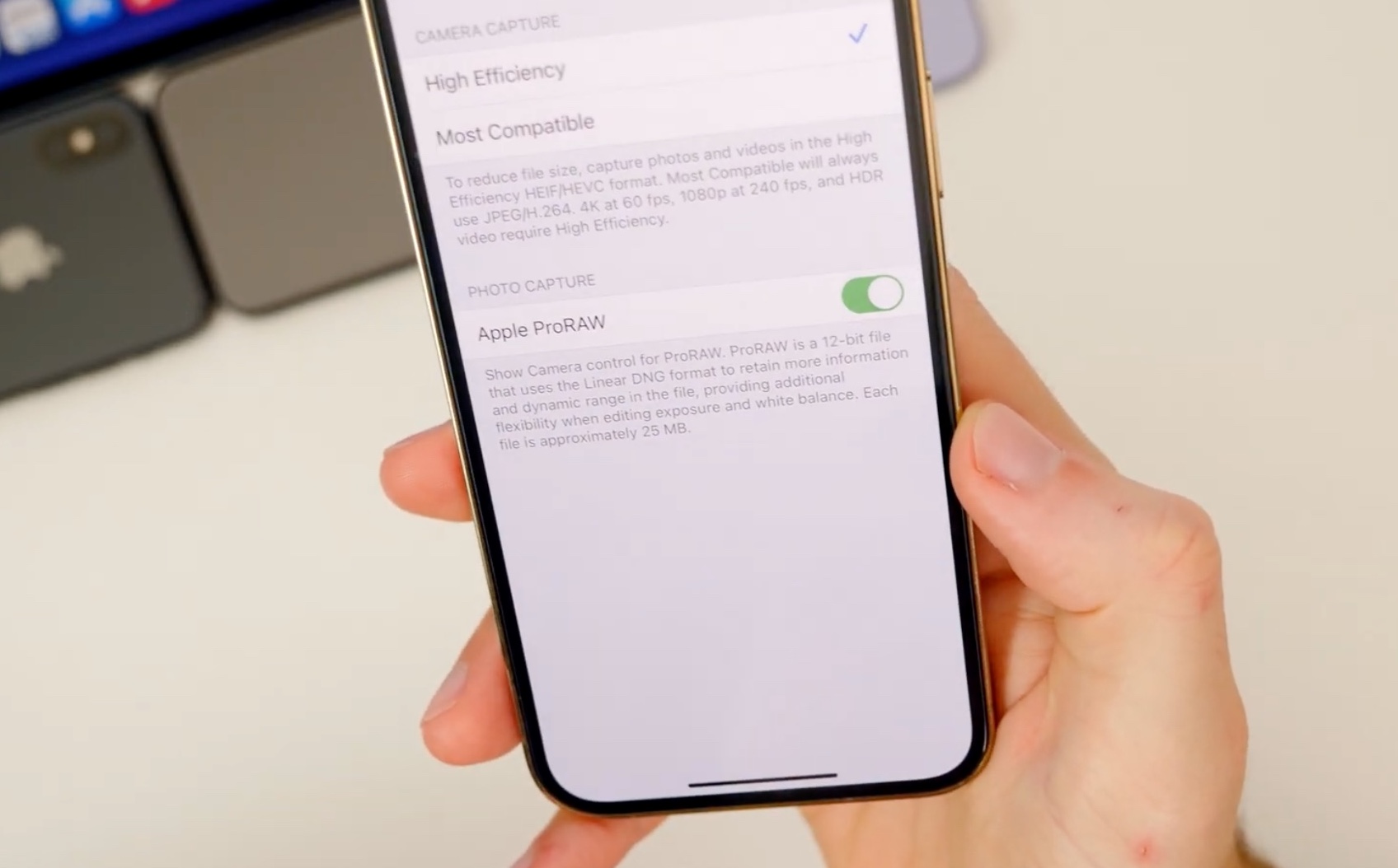 Apple ProRAW เป็นการนำการประมวลผลภาพแบบหลายเฟรม และการประมวลผลภาพถ่ายด้วยคอมพิวเตอร์ของ Apple มารวมกับความอเนกประสงค์ของไฟล์แบบ RAW ช่วยให้ผู้ใช้สามารถควบคุมสีสัน รายละเอียด ช่วงไดนามิก ซึ่งปรับแต่งได้ทั้งแอปปรับแต่งภาพบน iPhone หรือแอปอื่น ๆ