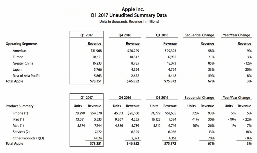 Apple เผยผลประกอบการไตรมาสที่ 1 ปี 2017 มีรายได้ทั้งสิ้น 78,400 ล้านดอลล่าร์ หุ้นตามมูลค่าอยู่ที่ 3.36 ดอลล่าร์ต่อหุ้น โดยรายได้หลักมาจากการจำหน่าย iPhone ในประเทศสหรัฐอเมริกา