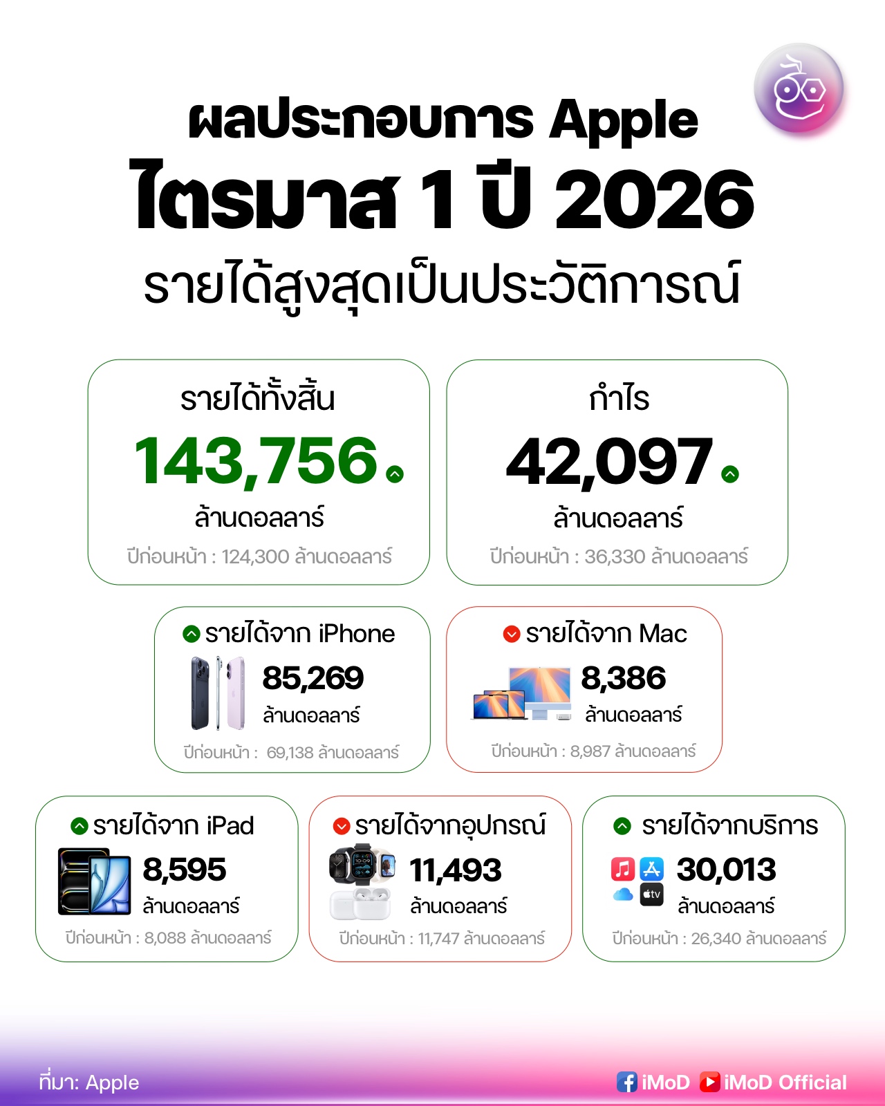 โดยไตรมาส 1 ปี 2026 ทำสถิติรายได้สูงสุดเป็นประวัติการณ์ของ Apple, iPhone และบริการ ก็ทำรายได้สถิติสูงสุดใหม่ เช่นกัน