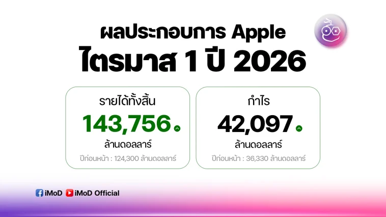 ผลประกอบการ Apple ไตรมาส 1 ปี 2026 ทำรายได้ไป 143,756 ล้านดอลลาร์