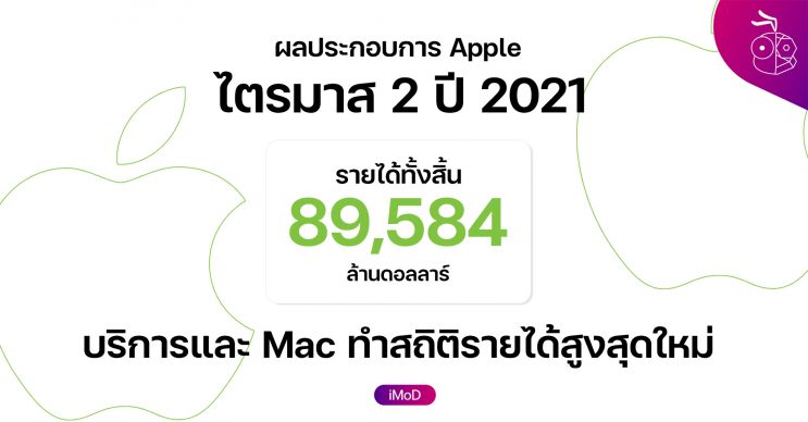 Apple ปิดไตรมาส 2 ปี 2021 เมื่อวันที่ 27 มี.ค. 202ๅ มีรายได้ทั้งสิ้น 89,584 ล้านดอลลาร์ส่วนกำไรอยู่ที่ 23,630 ล้านดอลลาร์ เพิ่มขึ้นจากช่วงเดียวกันของปีก่อนหน้าที่เคยทำได้ 11,249 ล้านดอลลาร์ และรายได้ในไตรมาสนี้สูงกว่าช่วงเดียวกันของปีก่อนหน้าถึง 54%