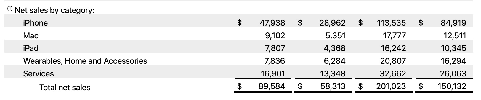 ไตรมาส 2 ปี 2021, รายได้จากผลิตภัณฑ์ทุกตัวของ Apple อย่าง iPhone, Mac, iPad, อุปกรณ์สวมใส่ และบริการเติบโตขึ้นมาก โดยเฉพาะบริการและ Mac ที่รายได้เพิ่มขึ้นมาก เมื่อเทียบจากช่วงเดียวกันของปีที่แล้ว
