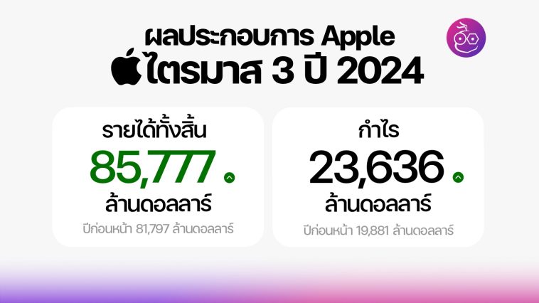 Apple ประกาศผลประกอบการไตรมาส 3 ปี 2024 (ไตรมาส 2 ปี 2024 ของบริษัทอื่น) ทำรายได้ไปทั้งสิ้น 85,777 ล้านดอลลาร์ เพื่มขึ้นจากปีก่อนหน้า 5%