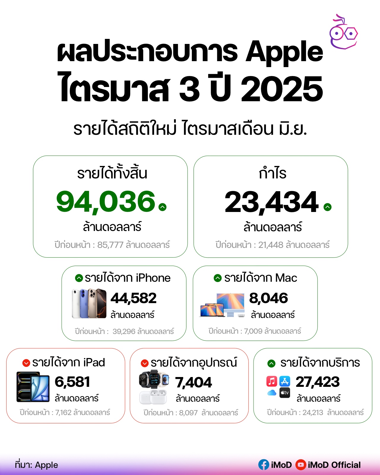 Apple ปิดไตรมาส 3 ปี 2025 เมื่อวันที่ 28 มิ.ย. 2025 ทำรายได้ไปทั้งสิ้น 94,036 ล้านดอลลาร์ เพื่มขึ้นจากปีก่อนหน้า 10%, ทำกำไรไป 23,434 ล้านดออลาร์ เพิ่มขึ้นจากปีก่อนหน้าด้วยเช่นกัน