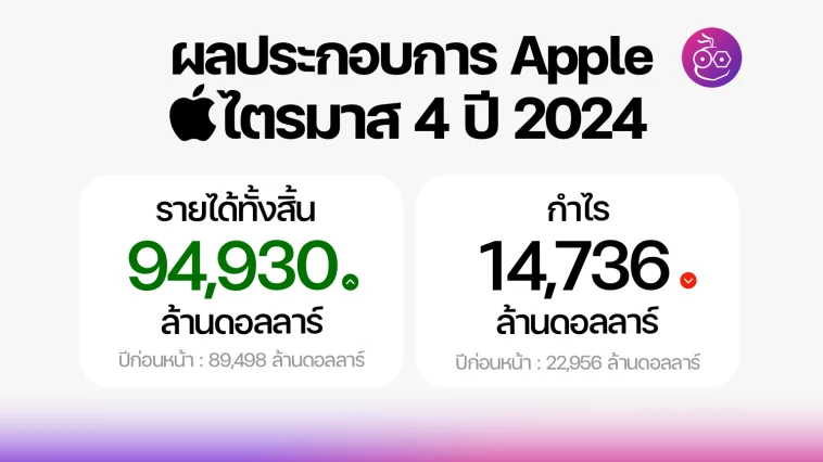 Apple ประกาศผลประกอบการไตรมาส 4 ปี 2024 (ไตรมาส 3 ปี 2024 ของบริษัทอื่น) ทำรายได้ไปทั้งสิ้น 94,930 ล้านดอลลาร์ เพื่มขึ้นจากปีก่อนหน้า 6%