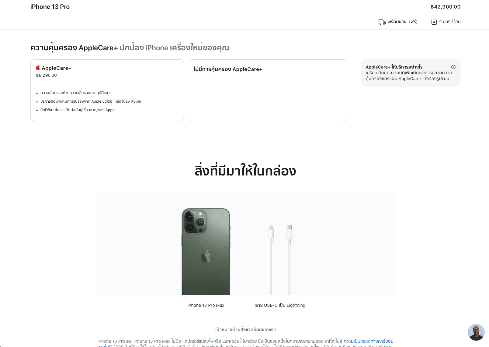 เมื่อลูกค้ากดเลือกสเปค เช่น รุ่น สี ความจุ ภาพก็จะเปลี่ยนไปตามด้วย พร้อมนำทางไปยังขั้นตอนต่าง ๆ สุดท้ายที่การเลือก AppleCare+
