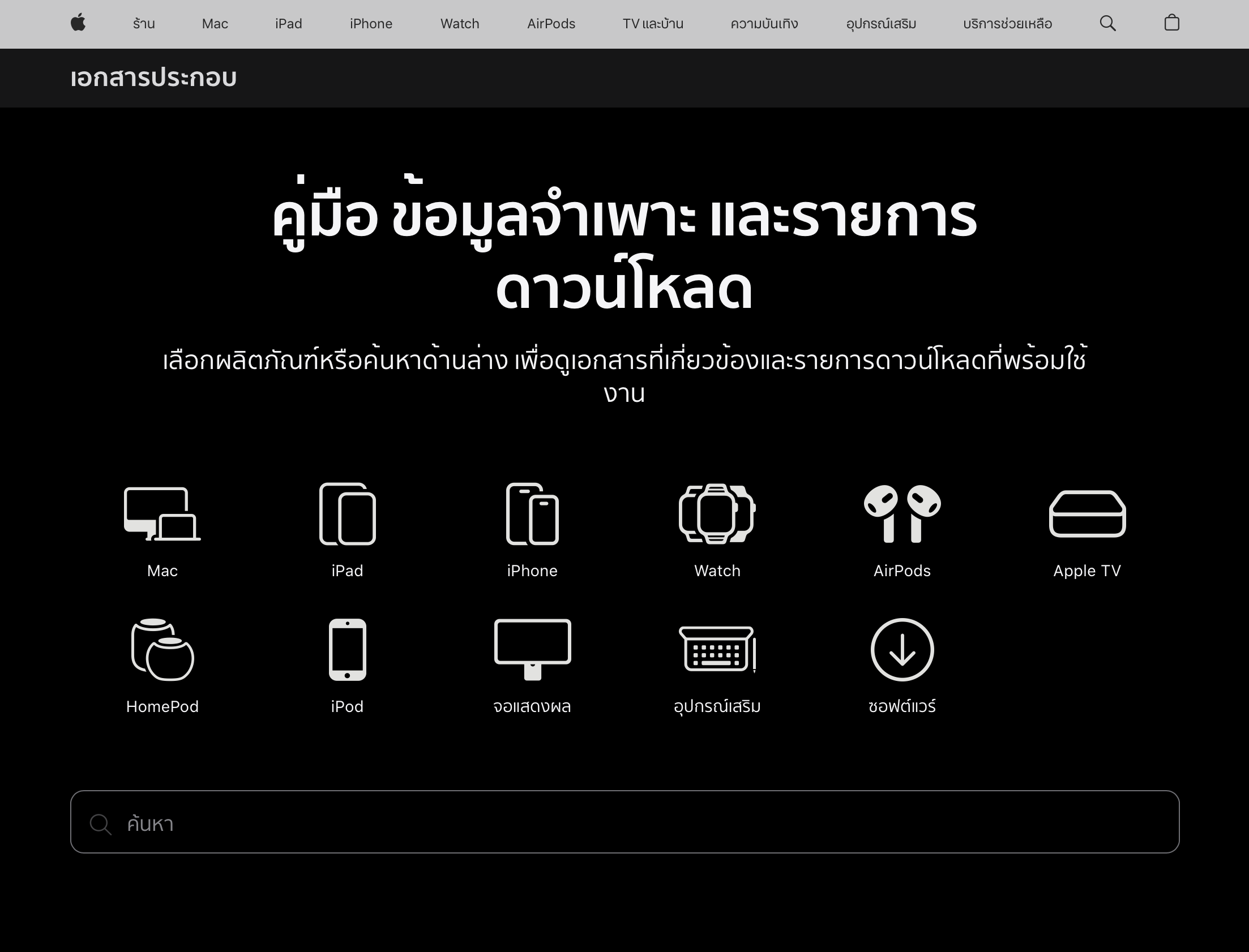 สำหรับเว็บไซต์ “เอกสารประกอบ” แบบใหม่ของ Apple นั้น จะรวมรายการคู่มือ ข้อมูลจำเพาะ และรายการดาวน์โหลด ไว้ที่เดียว โดยผู้ใช้สามารถกดเลือกเข้าไปดูตามสินค้าที่ต้องการได้เลย