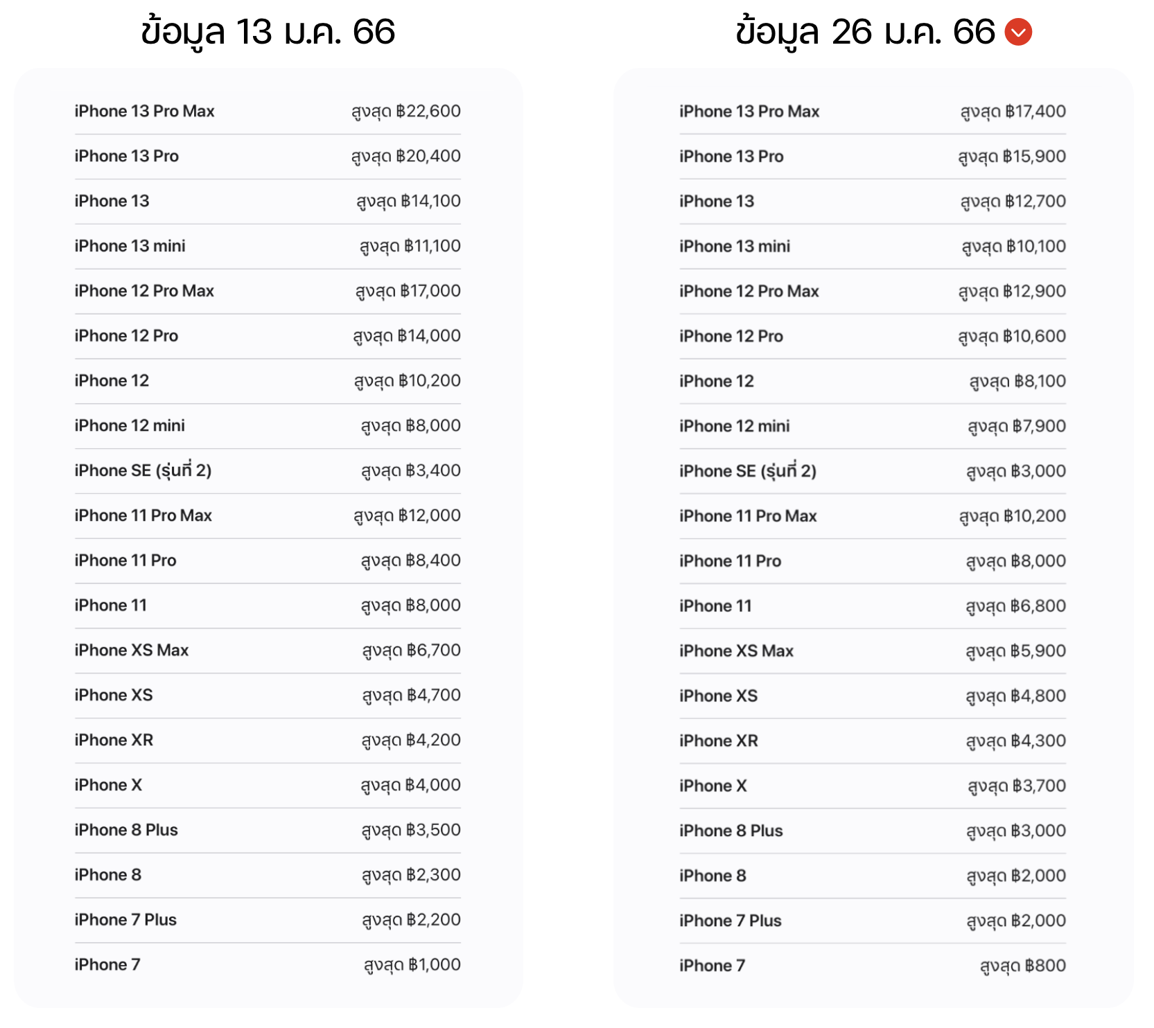 สำหรับมูลค่าที่ปรับลงนั้น ถูกปรับลดสูงสุดมากถึง 5,200 บาท เช่น จากเดิมหากนำ iPhone 13 Pro Max มา Trade-in ก่อนหน้านี้จะมีโอกาสถูกตีมูลค่าได้สูงสุด 22,600 บาท แต่ตอนนี้ถูกปรับเหลือ 17,400 บาท