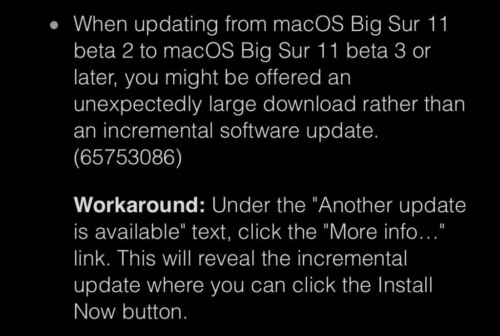ในการอัปเดตอาจจะพบกับการดาวน์โหลดไฟล์ขนาดใหญ่ Apple ได้อธิบายเพิ่มเติมว่า ให้ใช้คลิก More Info ที่อยู่ด้านล่างข้อความ Another Update is Available เพื่อแก้ไขปัญหาชั่วคราว