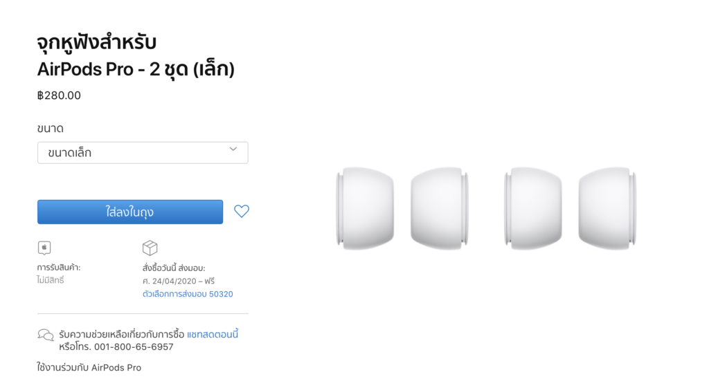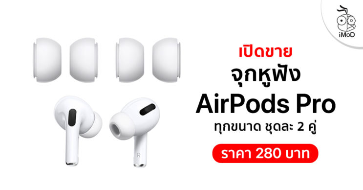 Apple เปิดขายจุกหูฟังสำหรับ AirPods Pro ชุดละ 2 คู่ (4 ชิ้น) ในราคา 280 บาททุกขนาด ประด้วย ขนาดเล็ก ขนาดกลาง และขนาดใหญ่ ผู้ใช้สามารถเลือกซื้อได้ตามขนาดที่ต้องการ