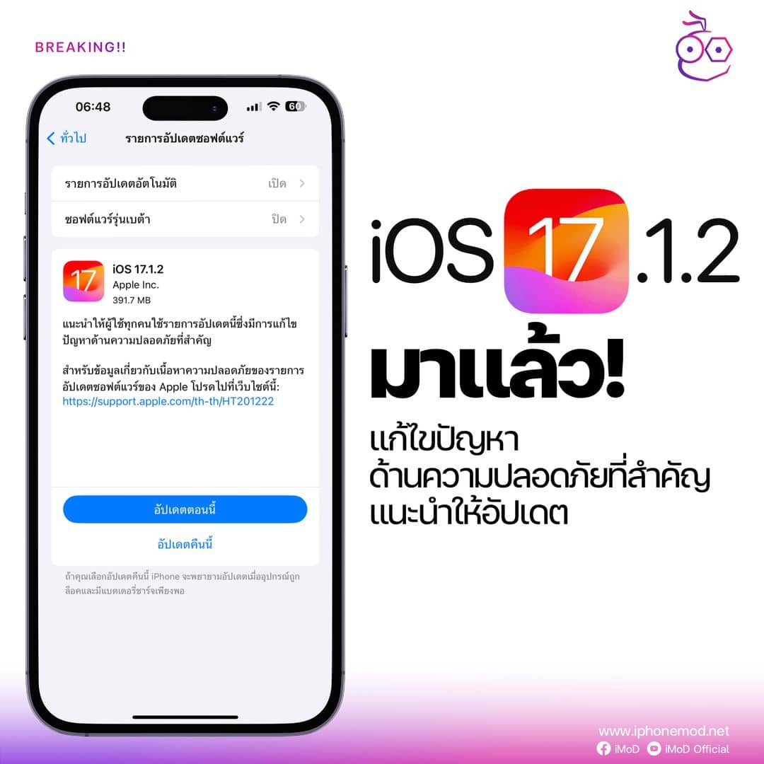 iOS 17.1.2 มาพร้อมการอัปเดตความปลอดภัยที่สำคัญ โดย Apple แนะนำให้ผู้ใช้อัปเดต