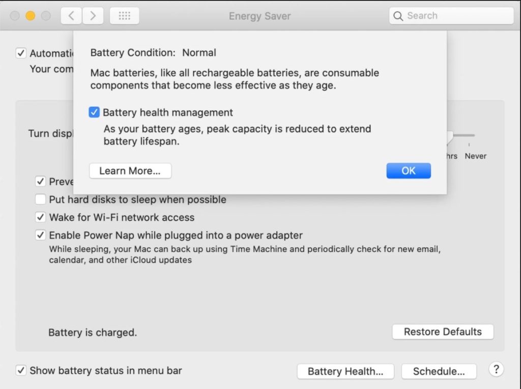 โดยระบบนี้จะรักษาสภาพแบตเตอรี่ด้วยการไม่ชาร์จ MacBook ให้เต็ม เพราะการชาร์จ MacBook เต็ม 100 เปอร์เซ็นต์แล้วยังเสียบชาร์จต่ออาจะทำให้อายุการใช้งานแบตเตอรี่ลดลง