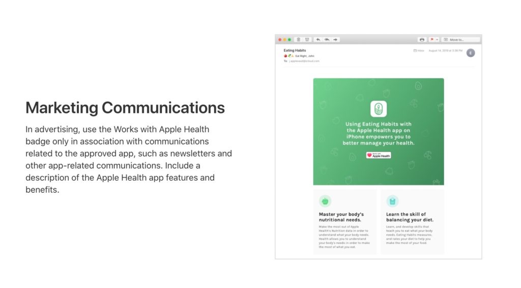 นักพัฒนาสามารถใช้โลโก้ Works With Apple Health กับเว็บไซต์ของแอป อีเมลแนะนำ การการแจ้งโปรโมชันอื่น ๆ ที่เกี่ยวข้องกับแอปสุขภาพได้ตามข้อกำหนดของ Apple