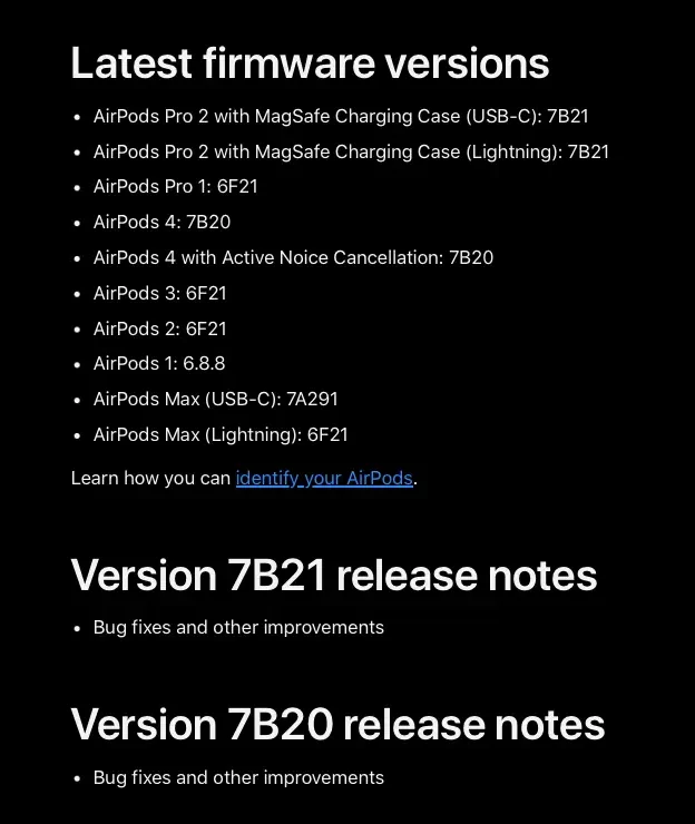 Apple ระบุว่า AirPods Firmware เวอร์ชัน 7B20 และ 7B21 นั้น เน้นแก้ปัญหาและปรับปรุงประสิทธิภาพจากเวอร์ชันก่อนหน้า แต่ไม่ได้ระบุว่าแก้ปัญหาและปรับปรุงจุดไหนบ้าง